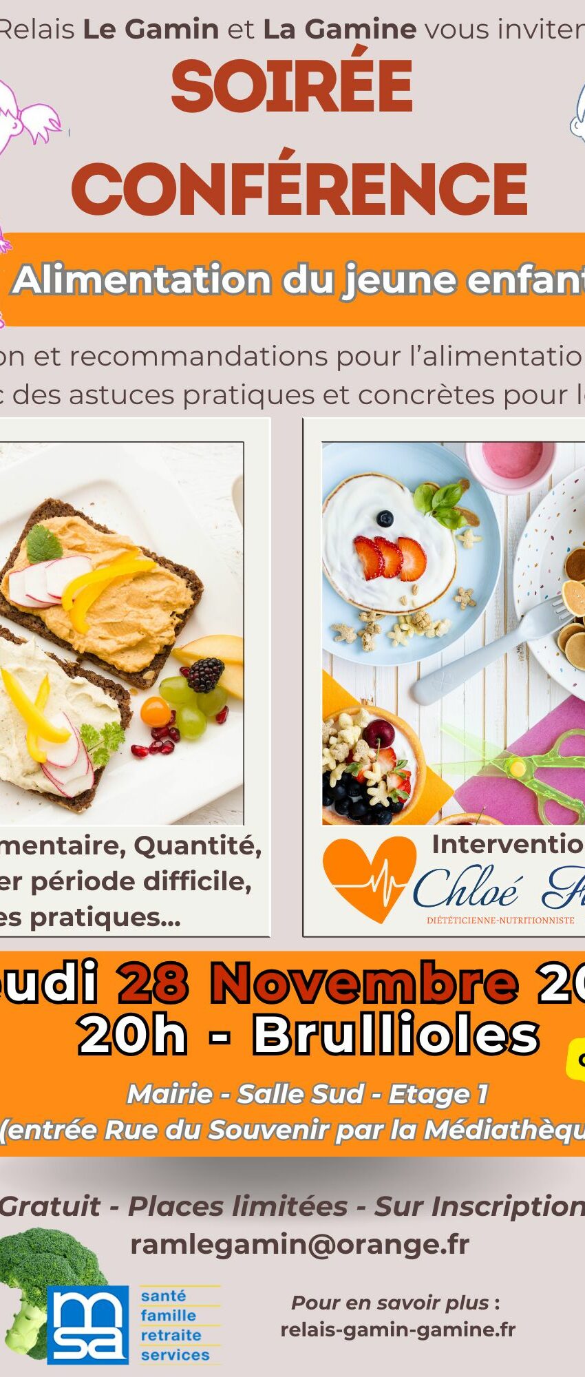 Soirée Conférence L'Alimentation est un sujet qui peut être sensible et pourtant indispensable pour le tout-petit. Transmettre le goût des bonnes choses, partager avec envie un repas, prendre plaisir à manger, autant de valeurs qui rassemblent autour de ce thème. Equilibre alimentaire, quantité, astuces pratiques, dédramatiser les périodes difficiles... Théorie [...]