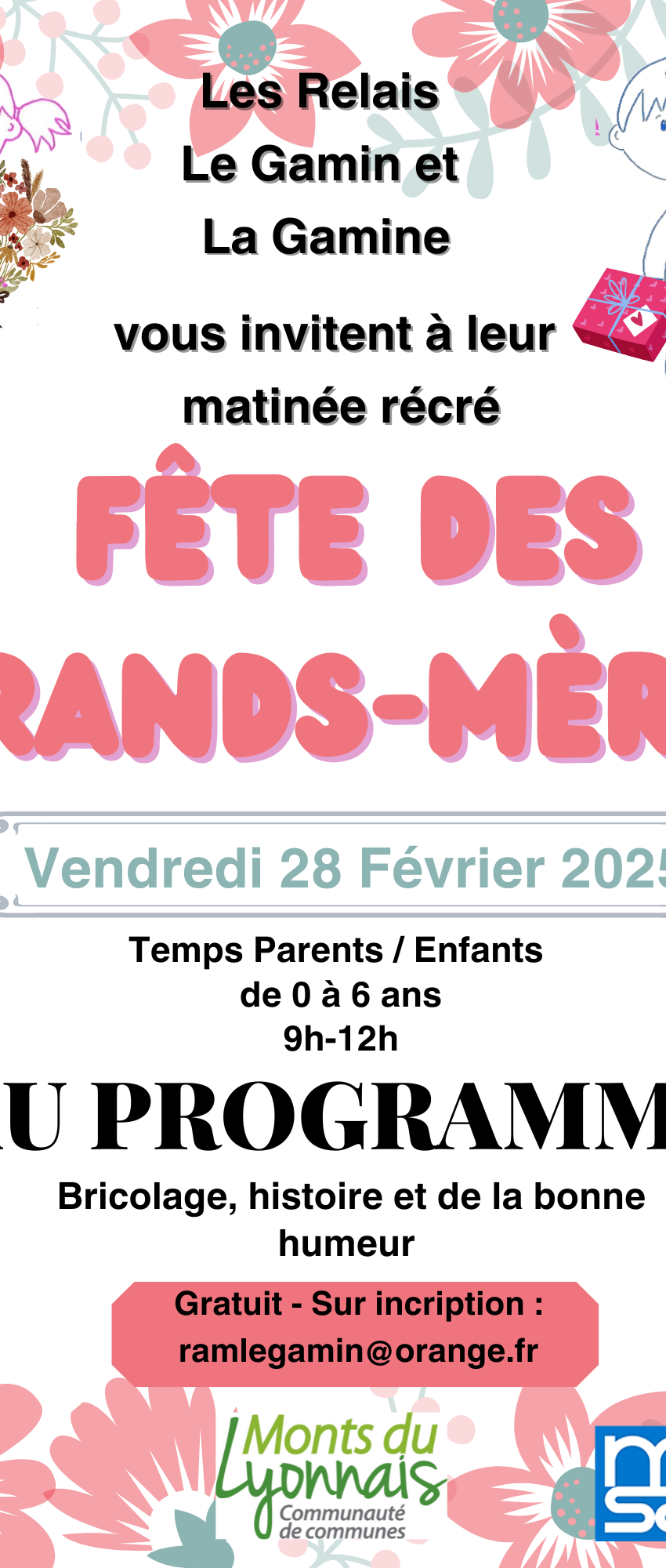 Pendant les vacances scolaires, on se retrouve à nos matinées récré ! Vendredi 28 Février 2025 de 9h à 12h Au programme : bricolage et histoires ! Gratuit, sur inscription par mail : ramlegamin@orange.fr Toutes les infos ici Pour rappel : les Matinées Récrés sont des temps proposés pendant les [...]