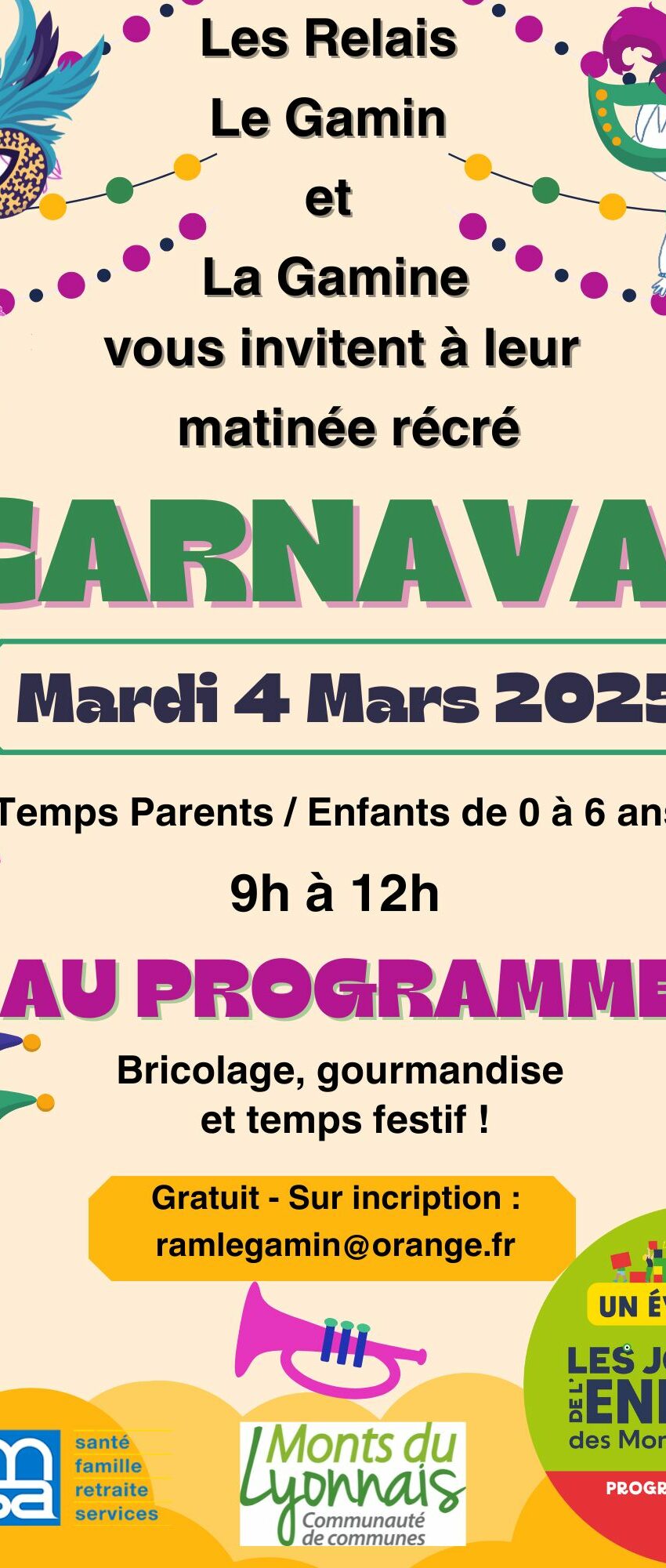 Pendant les vacances scolaires, on se retrouve à nos matinées récré ! Mardi 4 Mars 2025 de 9h à 12h Au programme : bricolage, gourmandise et temps festif ! Gratuit, sur inscription par mail : ramlegamin@orange.fr Toutes les infos ici Pour rappel : les Matinées Récrés sont des temps proposés [...]
