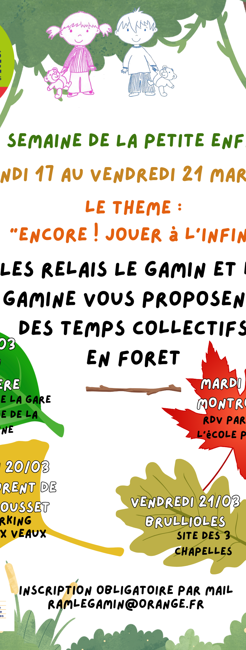 Du Lundi 17 au Vendredi 21 Mars 2025 : Semaine Petite Enfance "Encore ! Jouer à l'infini." A l'occasion de la semaine petite enfance qui a pour thème "Encore ! Jouer à l'infini !" Les Relais invitent ses adhérents à des temps collectifs en forêt ! Gratuit - Sur inscription [...]