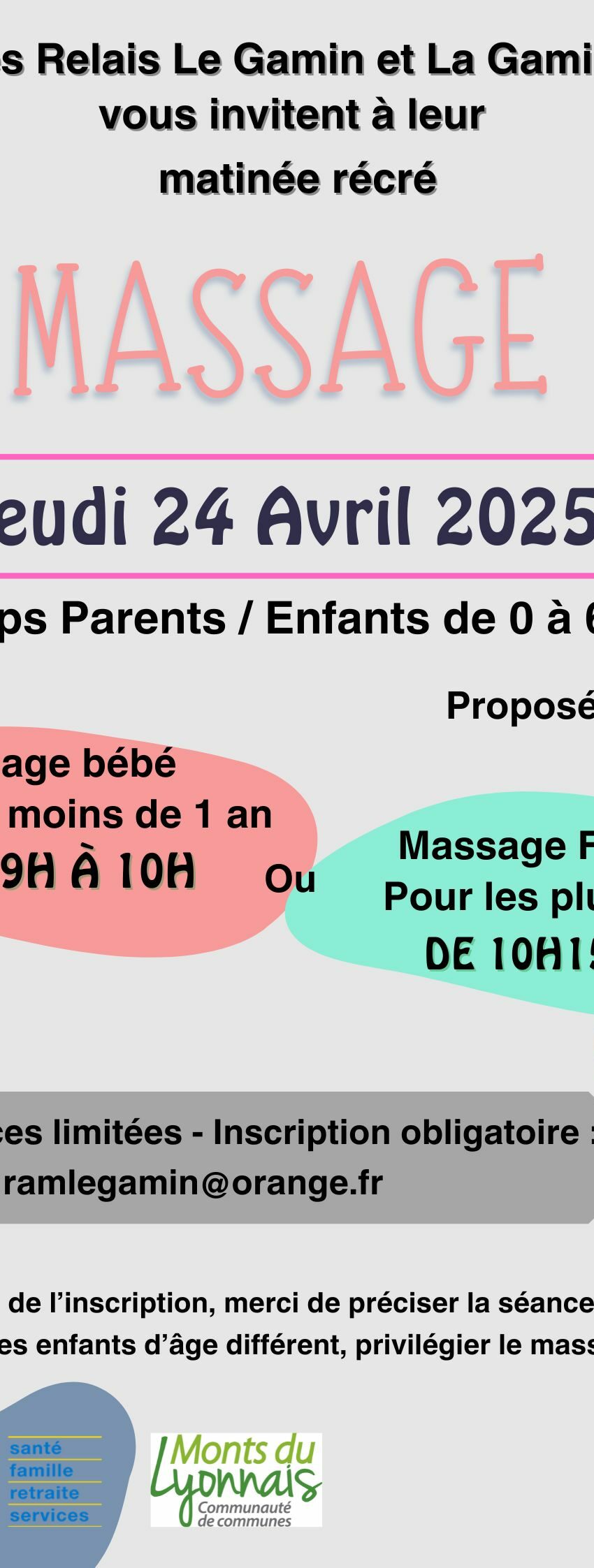 Pendant les vacances scolaires, on se retrouve à nos matinées récré ! Prochain rdv : Jeudi 24 Avril 2025 Nous aurons la chance de recevoir Alice Massardier de Parentaise 42 pour une matinée sous le signe du bien-être ! De 9h à 10h : Massage Bébé ! Découverte de gestes [...]