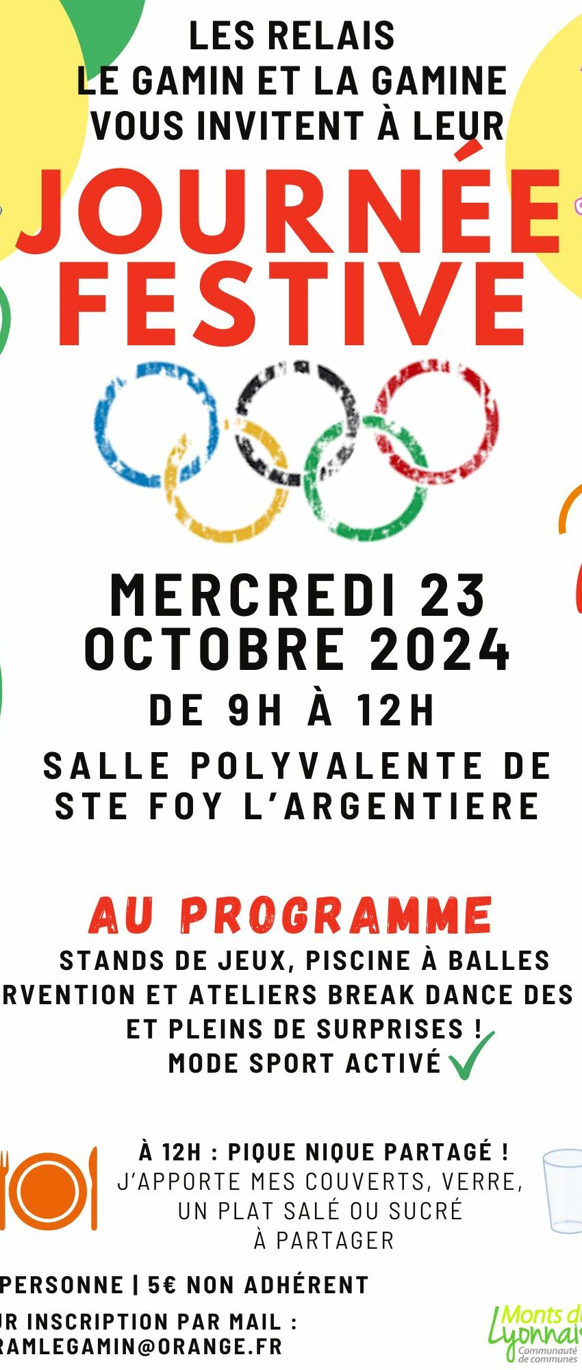 Les Relais vous invitent à leur Journée Festive ! Rdv le Mercredi 23 Octobre 2024 de 9h à 12h Salle polyvalente de Ste Foy l'Argentière Venez profiter de jeux ludiques autour des Jeux Olympiques et d'ateliers Break Dance avec les Aleas ! Dress code : Vêtements de sport ! 3€ [...]
