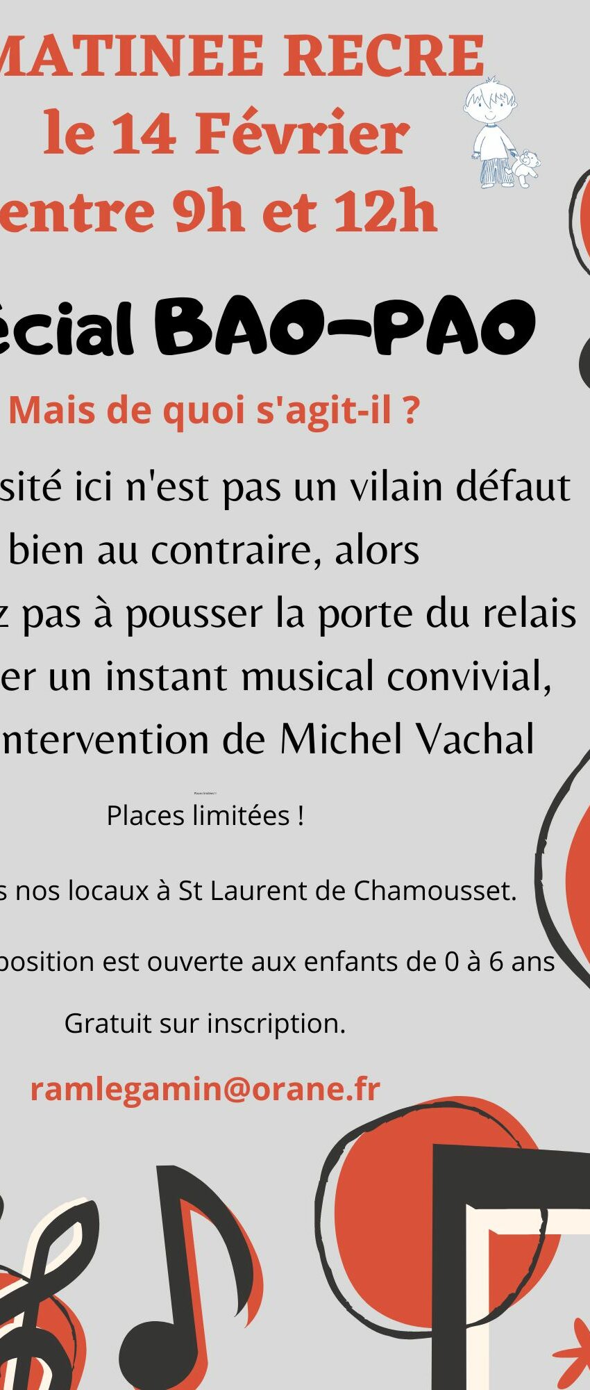 Pendant les vacances scolaires, on se retrouve à nos matinées récré ! Mardi 14 Février 2023 de 9h à 12h Venez découvrir un instrument bien curieux ... le BAO PAO Déjà COMPLET Gratuit, sur inscription par mail : ramlegamin@orange.fr Toutes les infos ici