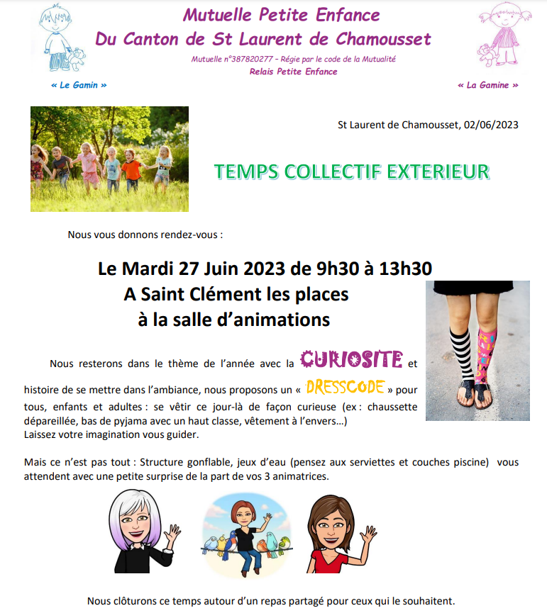 Mardi 27 Juin 2023: Temps Collectif Extérieur à St Clément les Places ! Nous resterons dans le thème de l’année avec la CURIOSITE et histoire de se mettre dans l’ambiance, nous proposons un « DRESSCODE » pour tous, enfants et adultes : se vêtir ce jour-là de façon curieuse (ex : chaussette dépareillée, bas [...]