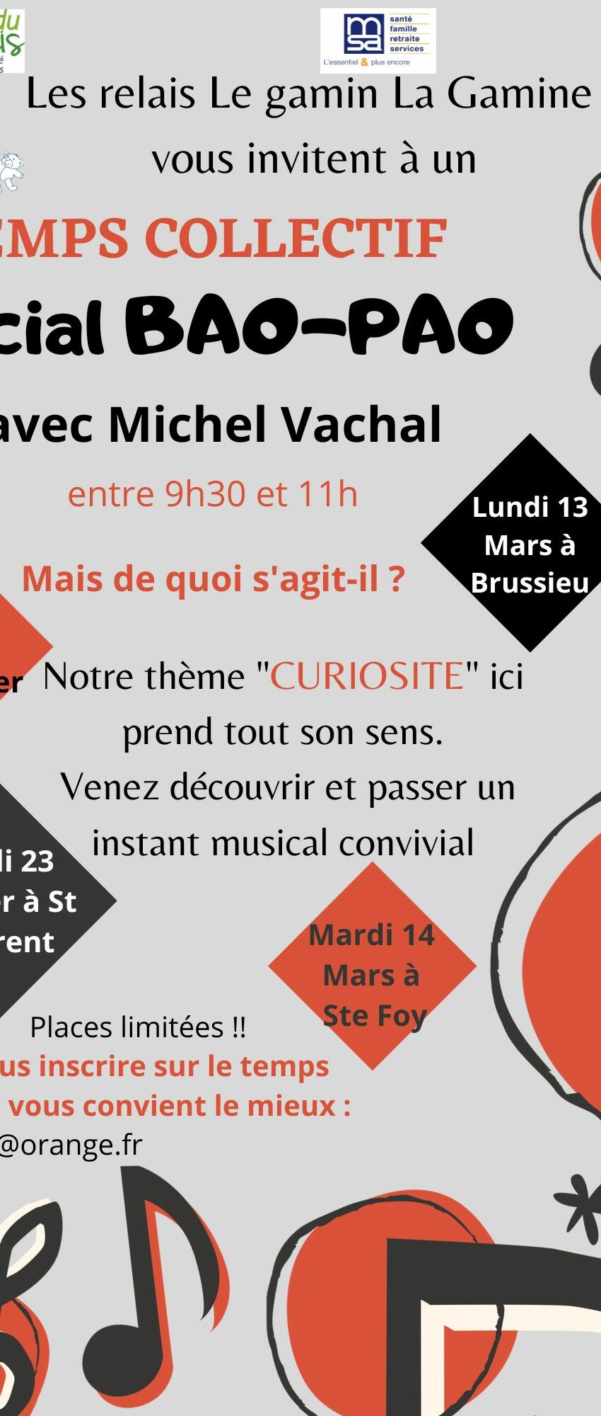 Temps Collectif Spécial Bao Pao avec Michel VACHAL Venez découvrir en temps collectif un instrument bien curieux... le Bao Pao ! . avec Michel VACHAL Gratuit - Sur inscription par mail : ramlegamin@orange.fr En précisant le jour et le lieu !