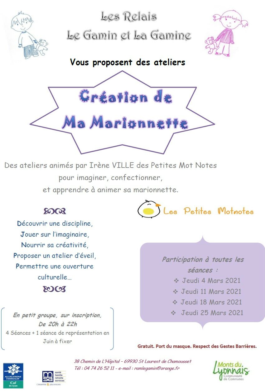 Les Relais Le Gamin & La Gamine vous invitent Ateliers Création de ma Marionnette Animés par Irène VILLE des Petites Mot Notes Ces ateliers permettent d’imaginer, confectionner et apprendre à animer sa marionnette. En petit groupe, sur inscription, de 20h à 22h – 4 Séances + 1 séance de […]
